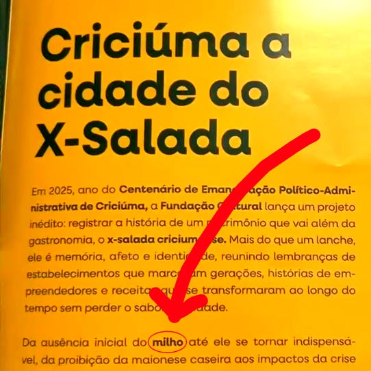 E olha que eles levam o negócio a sério mesmo. Pra você ter ideia, o Álbum Oficial de Criciúma dedica uma página inteira ao X-Salada, traçando a história do lanche desde a época em que ele ainda nem incluía milho.