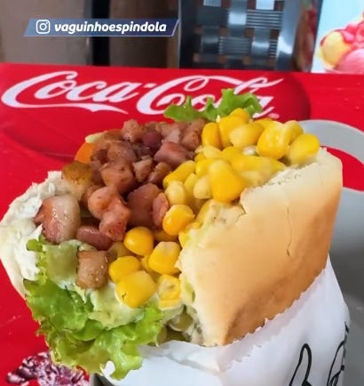 Tá explicado. Criciúma inventou a própria variante do lanche, que além do alface e tomate leva maionese, milho e ervilha. (Muito milho. Muita ervilha.)