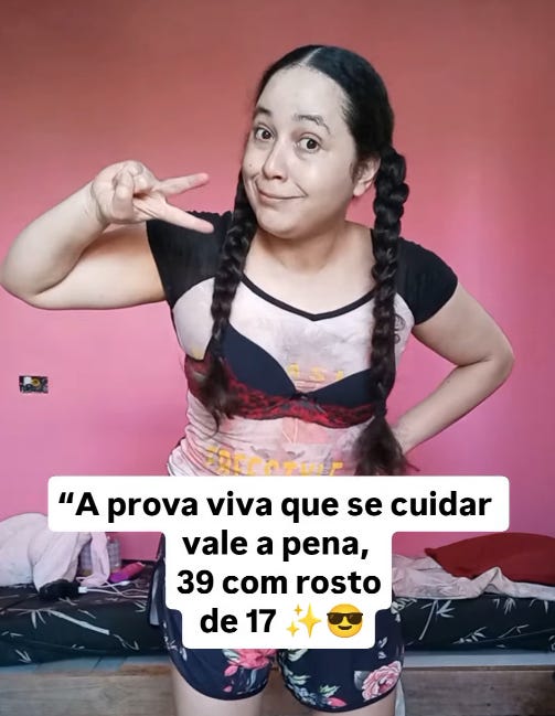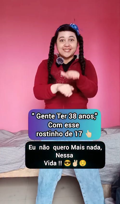 Pensando bem, talvez seja essa a intenção da Jozi. Numa sociedade obcecada pela juventude, ela ousa ser contracultura: rejeita a eterna adolescência e se antecipa, orgulhosa, ao lugar de Mulher Que Envelhece. Mensagem lindíssima e necessária; parabéns a ela! (Mas não se preocupe, Jozi. Você mesma ainda nem fez 18 anos. Tem muito chão pela frente!)