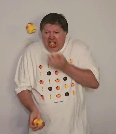 Coube ao Malabarista, então, a minha reeducação alimentar —coisa que ele vem tirando de letra. Raramente se vê uma pessoa tão determinada a incorporar frutas à própria dieta. Parece até que ele tá comendo à força, por recomendação médica, e esse malabares é a versão dele de tampar o nariz pra tomar xarope.