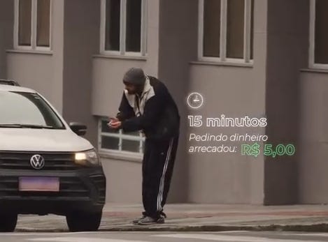 Que fique claro: esse vídeo é incrível. São mais de vinte horas do Vaguinho vagueando pela cidade, condensadas em cinco minutos pra garantir o engajamento nas redes. Tudo filmado às escondidas, claro, a fim de capturar reações genuínas, como na emocionante cena em que o prefeito (em situação de rua) é ignorado pela própria família.